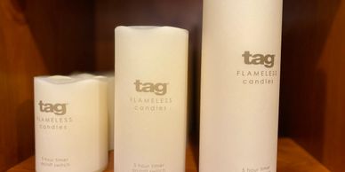 Flameless, battery operated candles, with a timer. Available in 3 different sizes. Birthday cake candles and tea lights available.