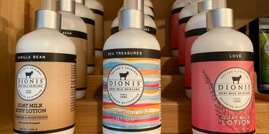 Dionis body lotions, hand creams, and lip balms are made with goat milk-"whats good for the inside is equally good for the outside!"